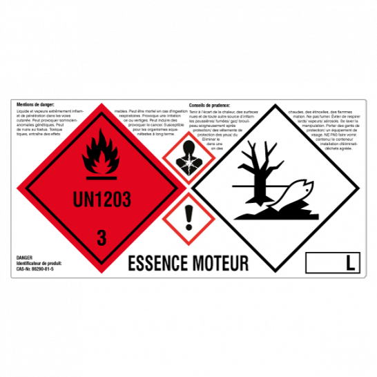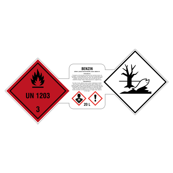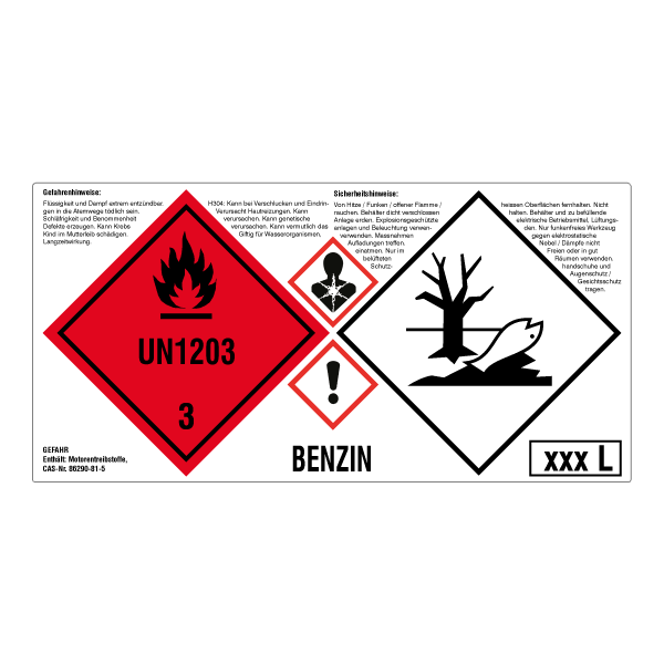 Kennzeichnung GHS/CLP und Gefahrgut Benzin (UN 1203)
