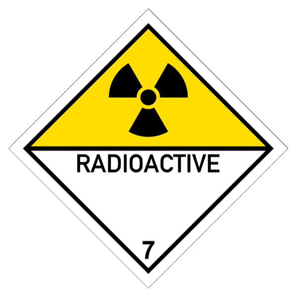 Etiketten und Grosszettel (Placard) zur Kennzeichnung von Versandstücken der Gefahrgutklasse 7D im Land- und Seeverkehr.