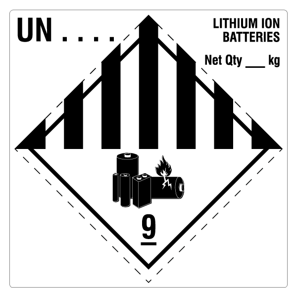 Gefahrzettel mit Versandbezeichnung (Lithium-Ionen-Batterien), UN-Nummer und Nettomenge für alle Verkehrsträger